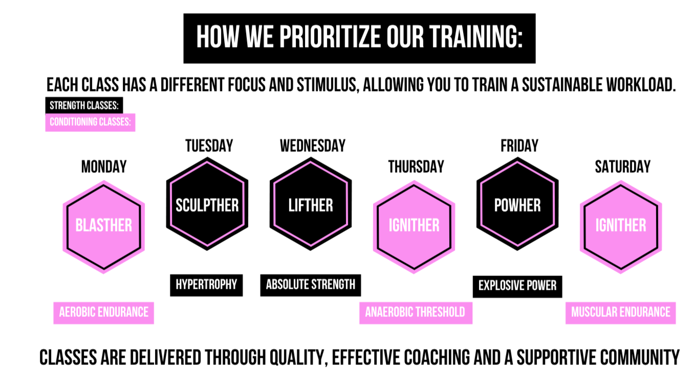 Group classes follow our comprehensive training program designed specifically for women's unique physiological needs and delivered in a supportive all-female community.